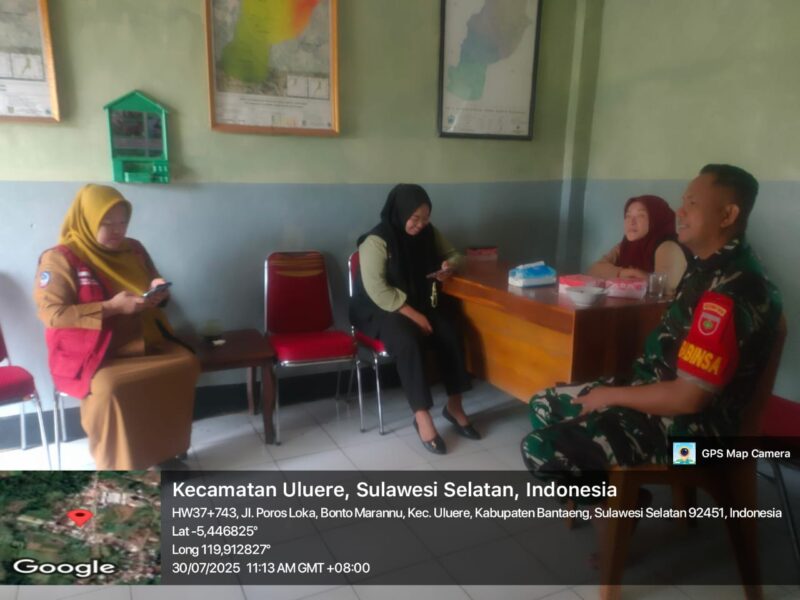 Bantaeng, — Dalam rangka mempererat sinergi antara aparat kewilayahan dengan perangkat desa, Babinsa Desa Bonto Marannu Koramil 1410-01/Bissappu Kodim 1410/Bantaeng, Serka Jusri, melaksanakan kegiatan komunikasi sosial (komsos) bersama Sekretaris Desa Bonto Marannu, Ibu Hanafia, beserta staf desa di ruang kerja kantor desa setempat. Rabu 30 Juli 2025