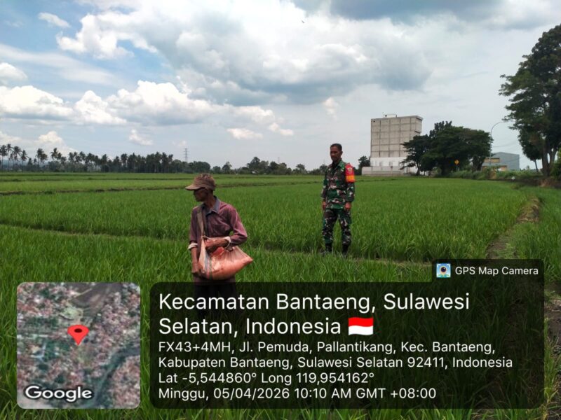 BANTAENG, Teropong Barat.com, – Babinsa Kelurahan Bonto Rita, Koramil 1410-01/Bissappu, Kodim 1410/Bantaeng, Serma Syamsuddin melaksanakan kegiatan pendampingan ketahanan pangan (Hanpangan) dalam rangka Luas Tambah Tanam (LTT). Kegiatan ini berlangsung di wilayah persawahan Pok Tani Tala-tala, Jalan Lingkar, Kelurahan Bonto Rita, Kecamatan Bissappu, Kabupaten Bantaeng. Minggu (05/04/2026)