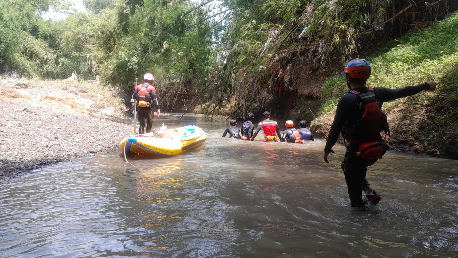 Pencarian melibatkan BPBD Kabupaten Probolinggo, Basarnas Banyuwangi, relawan Songa Rafting, serta unsur masyarakat setempat. Penyisiran dilakukan dari lokasi kejadian menuju hilir dan hulu sungai dengan radius beberapa kilometer. Komandan Tim Pencarian Basarnas Banyuwangi, Andi Irawan, menjelaskan pencarian dibagi menjadi tiga tim untuk memperluas jangkauan. “Pencarian kami maksimalkan hingga sore hari. Bila belum ditemukan, kegiatan akan dilanjutkan kembali besok pagi,” kata Andi. AKP Ahmad Jayadi juga mengimbau masyarakat, khususnya warga yang bermukim di sekitar bantaran Sungai Bayeman, agar ikut berperan aktif membantu pencarian.