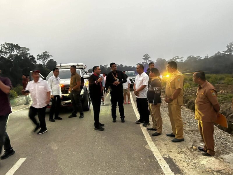 Pakpak Bharat, Teropong Barat.com/Dalam kunjungannya di Kabupaten Pakpak Bharat, Gubernur Sumatera Utara M Bobby Afif Nasution melihat langsung kondisi ruas jalan Kuta Jungak-Sigalingging di Desa Kuta Jungak, Kecamatan Siempat Rube. Suasana temaram menjelang malam ketika rombongan Gubernur bersama Bupati Pakpak Bharat tiba di tempat ini.