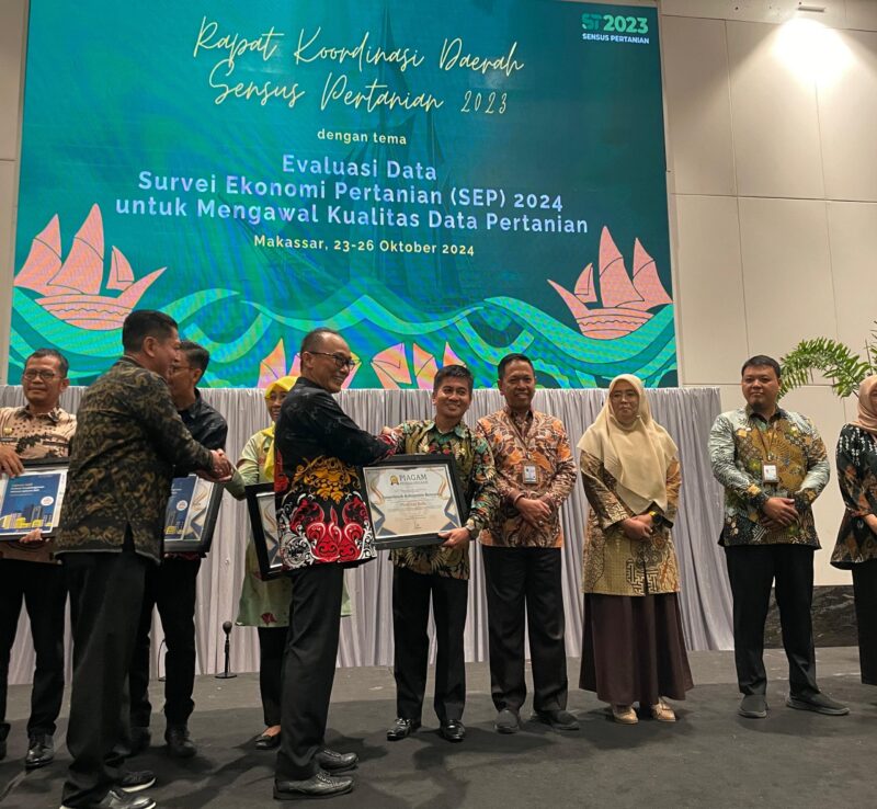 Penghargaan tersebut diserahkan pada Rapat Koordinasi Daerah (Rakorda) ST2023 Badan Pusat Statistik Provinsi /Kabupaten/Kota se-Sulawesi Selatan, di Phinisi Ballroom, Hotel Claro, Makassar, Kamis (24/10).