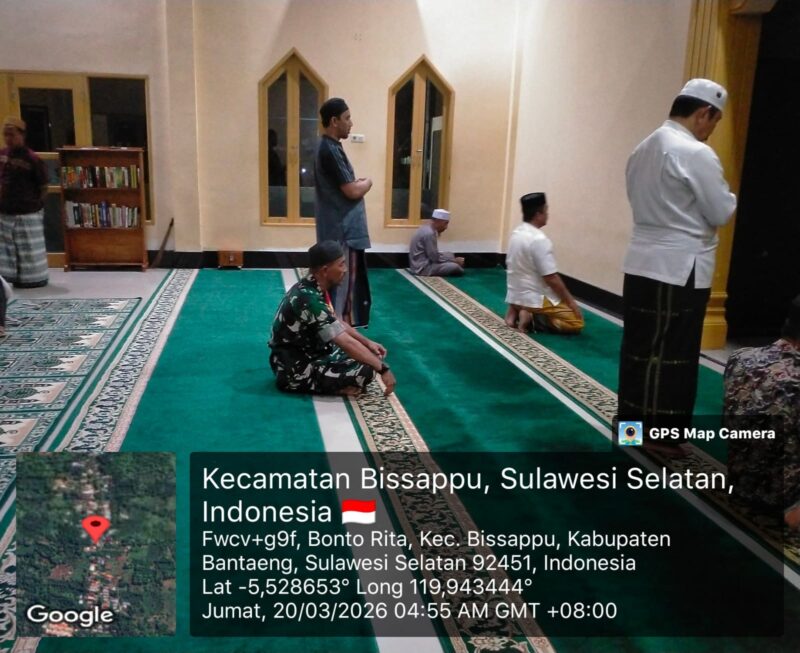 BANTAENG, Teropong Barat.com, – Babinsa Kelurahan Bonto Rita, Koramil 1410-01/Bissappu, Kodim 1410/Bantaeng, Serma Syamsuddin melaksanakan kegiatan ibadah Sholat Subuh berjamaah bersama warga sebagai langkah mempererat hubungan silaturahmi dengan masyarakat serta meningkatkan keimanan dan ketakwaan. Kegiatan tersebut berlangsung di Masjid Nurul Amin, Kampung Parang Labbua, Kelurahan Bonto Rita, Kecamatan Bissappu, Kabupaten Bantaeng. Jumat (20/03/2026)