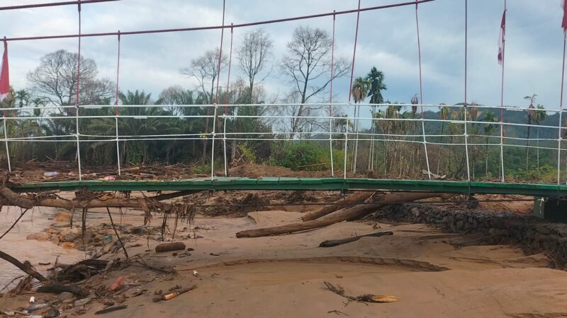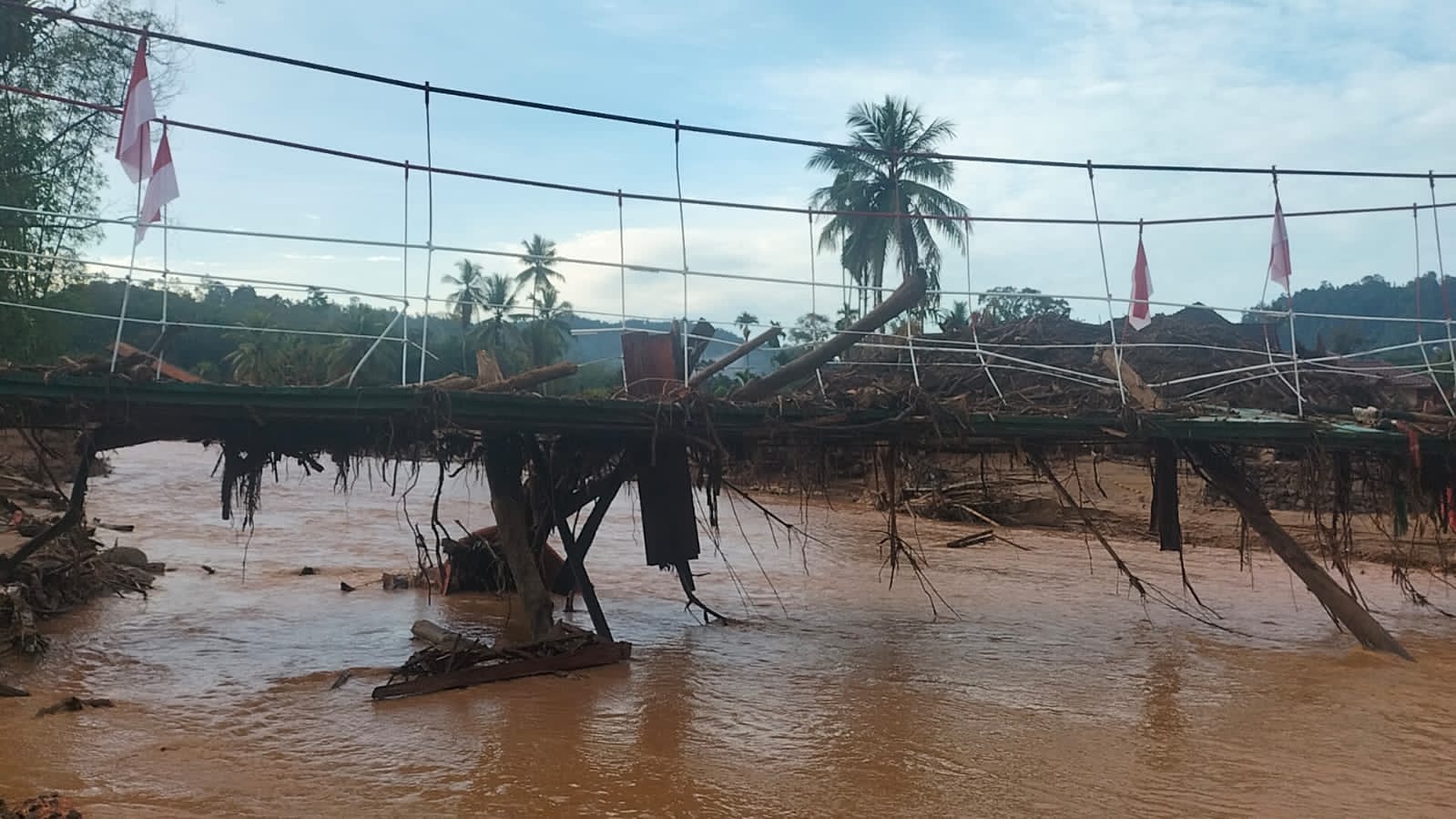 Tapanuli Tengah, (TEROPONGBARAT.COM)  Akibat curah hujan yang tinggi, Jembatan Gantung Perintis Garuda mengalami kerusakan sedang namun tidak sampai terputus di Kelurahan Tukka, Kecamatan Tukka, Kabupaten Tapanuli Tengah, Kamis (12/2/2026). Curah hujan terjadi pada sore hari sekitar pukul 17.00 WIB dan menyebabkan meningkatnya debit air di hulu sungai hingga terjadi luapan air yang mengakibatkan banjir. Kondisi tersebut juga disertai banyaknya kiriman material sampah kayu dari hulu yang menghantam badan jembatan. Hujan kemudian berhenti sekitar pukul 20.00 WIB. Monitoring dilakukan sekitar pukul 07.25 WIB untuk mengecek kondisi jembatan, dan hasil pengecekan menunjukkan jembatan masih dapat digunakan sebagai akses masyarakat.Kerusakan yang ditemukan antara lain satu sisi kabel seling bagian bawah lepas dari pembautan rel serta besi selendang pagar sebagian patah dan bengkok. Sementara itu, papan lantai jembatan, bronjong, dan angkur masih dalam kondisi utuh.
