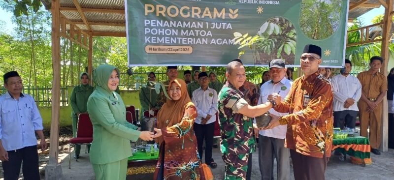 BANTAENG – Komandan Kodim 1410/Bantaeng Letkol Inf Eka Agus Indarta, S.Psi., M.Psi., di dampingi Ketua Persit Kartika Chandra Kirana Cabang XXVII Dim 1410, Ny. Meri Eka Agus Indarta, beserta Personil Babinsa dan Pengurus Persit menghadiri gerakan penanaman 1 juta pohon matoa yang di laksanakan secara serentak se Indonesia melalui Zoom di buka oleh Menteri Agama Republik Indonesia Prof Nasaruddin Umar, kegiatan Zoom bertempat di Halaman Kantor Urusan Agama, Desa Nipa-Nipa, Kecamatan Pa’jukukang Kabupaten Bantaeng. Selasa (22/04/2025).
