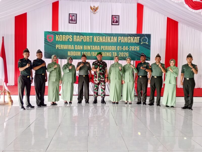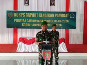 BANTAENG, Teropong Barat.com, – Komandan Kodim (Dandim) 1410/Bantaeng Letkol Arh M. Husni Hidayat Muchlis, S.E., memimpin langsung pelaksanaan acara Korp Raport kenaikan pangkat Perwira dan Bintara Terhitung Mulai Tanggal (TMT) 1 April 2026 yang berlangsung khidmat di Aula Butta Toa Makodim 1410/Bantaeng, Jl. Dahlia Kelurahan Pallantikang, Kecamatan Bantaeng, Kabupaten Bantaeng. Senin (06/04/2026).