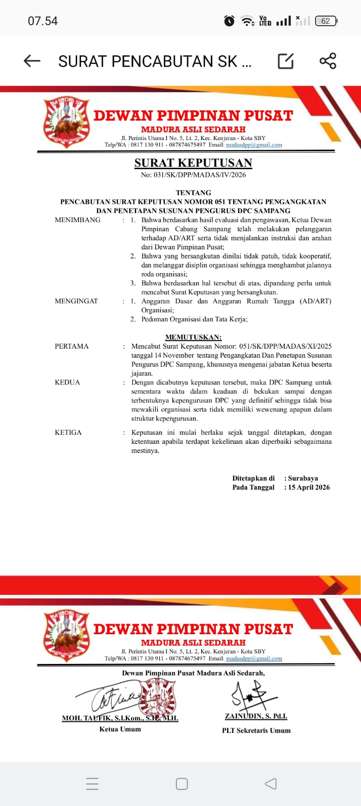Dalam dokumen resmi yang diterima, pencabutan ini merupakan tindak lanjut dari hasil evaluasi dan pengawasan internal organisasi terhadap kinerja kepengurusan DPC Sampang.