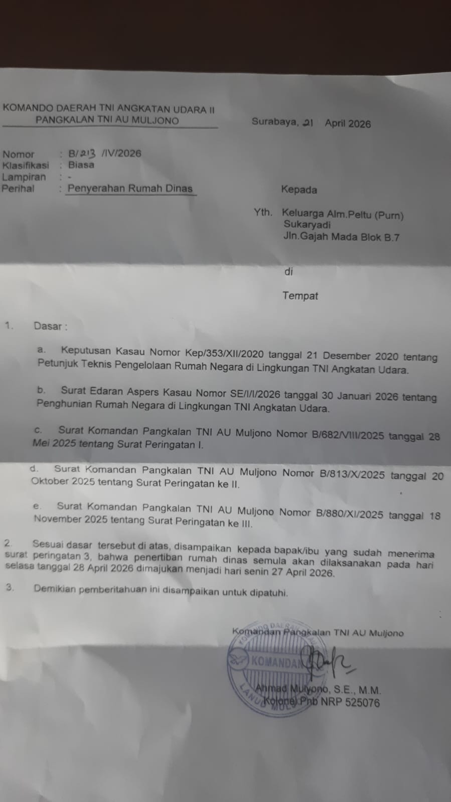 Surabaya// Teropongbarat.com ‎Ironi terasa kental di Perum AURI, Kelurahan Sawunggaling, Kecamatan Wonokromo. Di saat banyak orang membayangkan masa pensiun sebagai waktu menikmati hari tua dengan tenang, Heru Arijanto (64), pensiunan AURI, justru menghadapi kenyataan pahit: sakit berkepanjangan dan ancaman kehilangan tempat tinggal.Surat pemberitahuan bernomor B/213/IV/2026 yang ditandatangani Komandan Pangkalan TNI AU Mulyono, Ahmad Mulyono, S.E., M.M., menjadi semacam “kado” yang datang menjelang penghujung April. Isinya tegas, penghuni diminta angkat kaki dari rumah dinas pada 27 April 2026.