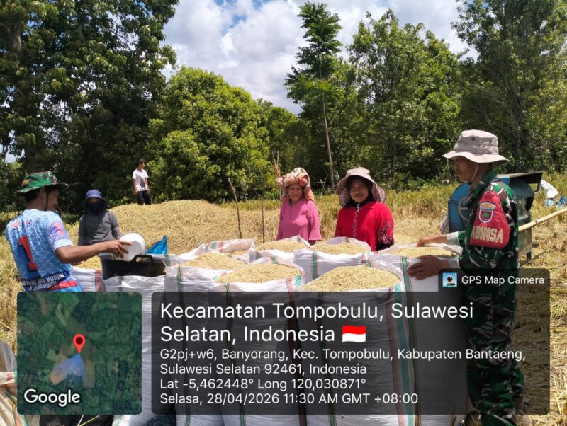 BANTAENG, Teropong Barat.com, – Babinsa Kelurahan Banyorang, Koramil 1410-03/Tompobulu, Kodim 1410/Bantaeng, Serma Ahmad Sabang melaksanakan kegiatan pendampingan panen padi dalam rangka mendukung program perluasan tambah tanam (LTT) di wilayah binaannya. Kegiatan ini berlangsung di lokasi Bonto Loe, Kelurahan Banyorang, Kecamatan Tompobulu. Selasa (28/04/2026)