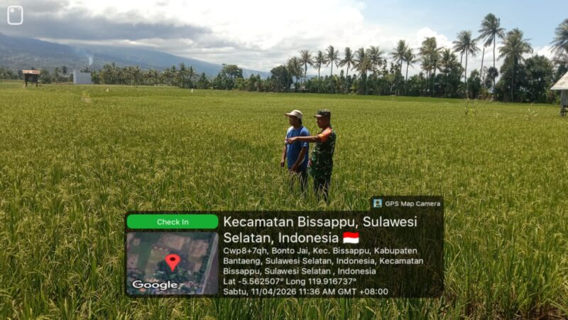 BANTAENG, Teropong Barat.com, – Babinsa Desa Bonto Jai, Koramil 1410-01/Bissappu, Kodim 1410/Bantaeng, Pelda Andi Zulkalfian melaksanakan kegiatan monitoring kondisi tanaman padi di wilayah binaannya yang berada di Desa Bonto Jai, Kecamatan Bisappu, Kabupaten Bantaeng. Sabtu (11/04/2026)