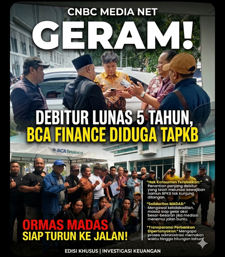 _Debitur Lunas 5 Tahun, BPKB Tak Kunjung Diberikan_ *Surabaya, 27 April 2026* – Sejumlah organisasi masyarakat yang tergabung dalam aliansi pendamping debitur, termasuk Ormas MADAS, hari ini mendatangi kantor BCA Finance di Surabaya. Kedatangan tersebut untuk menuntut penyerahan BPKB milik debitur berinisial And yang telah melunasi seluruh kewajibannya.