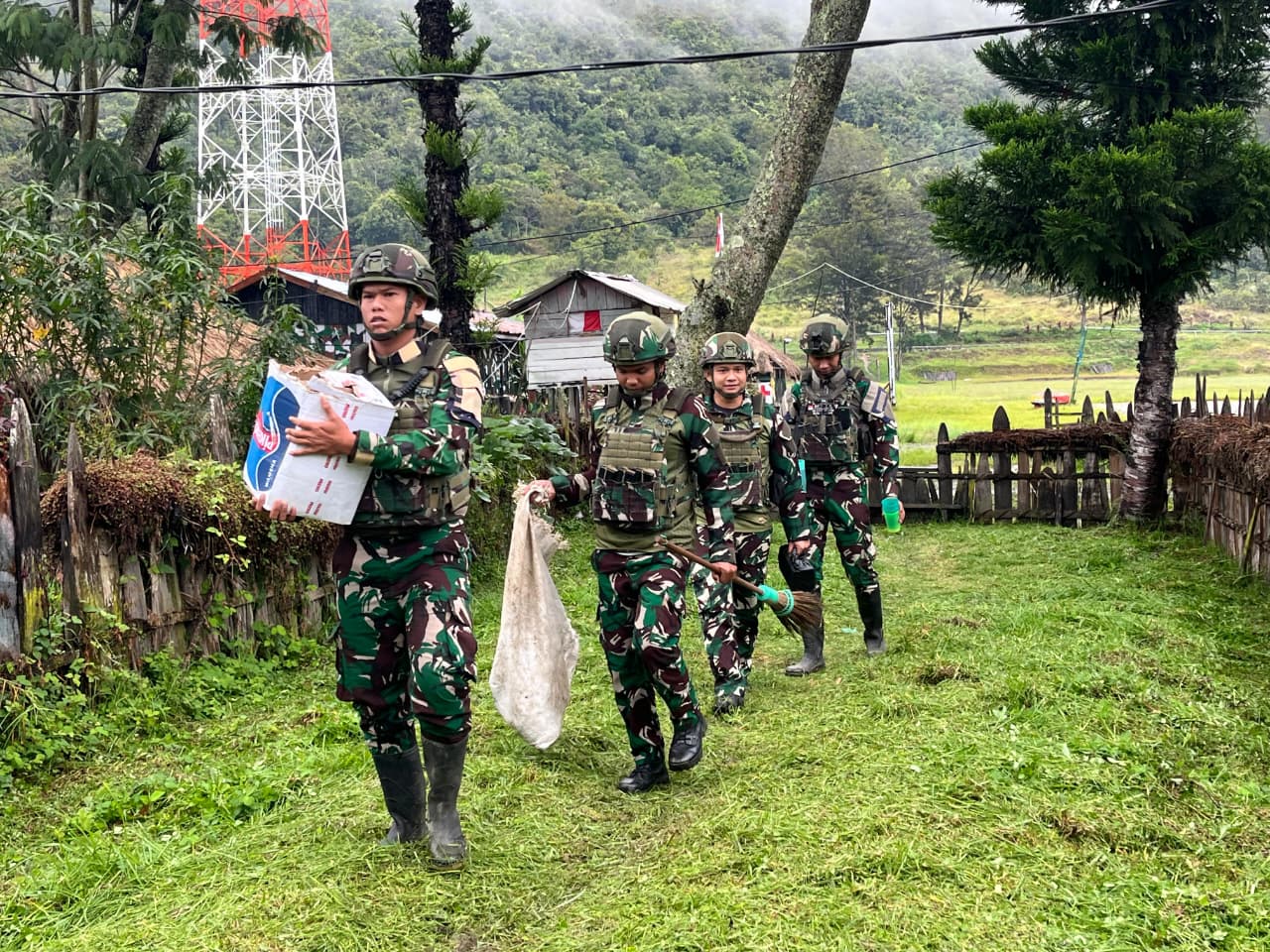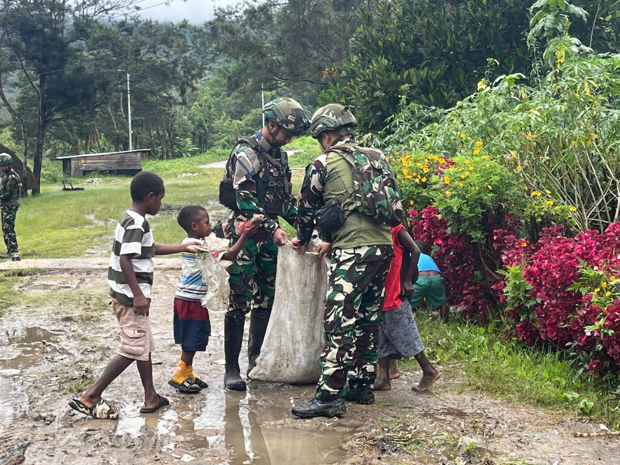 Bolakme, // Wujud kepedulian terhadap kebersihan lingkungan sekaligus mempererat hubungan dengan masyarakat, Satgas Yonif 521/DY melaksanakan kegiatan gotong royong bersama warga dan anak-anak di Distrik Bolakme, Kabupaten Jayawijaya, Papua Pegunungan. (10/4/2026).