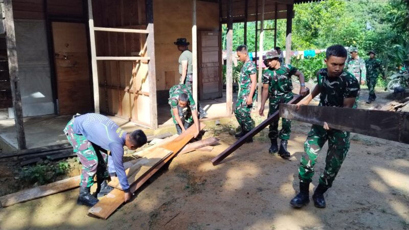 Sejak pagi, personel Satgas TMMD bersama warga bahu-membahu merobohkan bagian rumah yang telah lapuk. Tanpa sekat, mereka bekerja bersama, mempercepat tahapan awal rehabilitasi rumah tidak layak huni (RTLH) milik lansia tersebut.