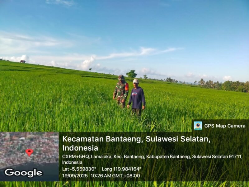 BANTAENG, Teropong Barat.com, — Babinsa Kelurahan Lamalaka, Koramil 1410-02/Eremerasa, Sertu Salasing, melaksanakan kegiatan pemantauan sekaligus pendampingan kepada warga binaan dalam rangka mendukung ketahanan pangan di wilayahnya. Kegiatan ini berlangsung di lahan persawahan milik salah seorang warga bernama Hamsir, di Kampung Gusung, Kelurahan Lamalaka, Kecamatan Bantaeng, Kabupaten Bantaeng. Jumat (19/9/2025)