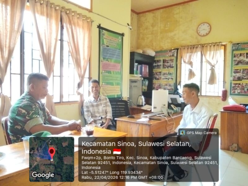 BANTAENG, Teropong Barat.com, – Babinsa Desa Bonto Tiro, Koramil 1410-01/Bissappu, Kodim 1410/Bantaeng, Pelda Samaing melaksanakan kegiatan komunikasi sosial (komsos). Kegiatan tersebut berlangsung di Kantor Desa Bonto Tiro, Kecamatan Sinoa, Kabupaten Bantaeng. Rabu (22/04/2026)
