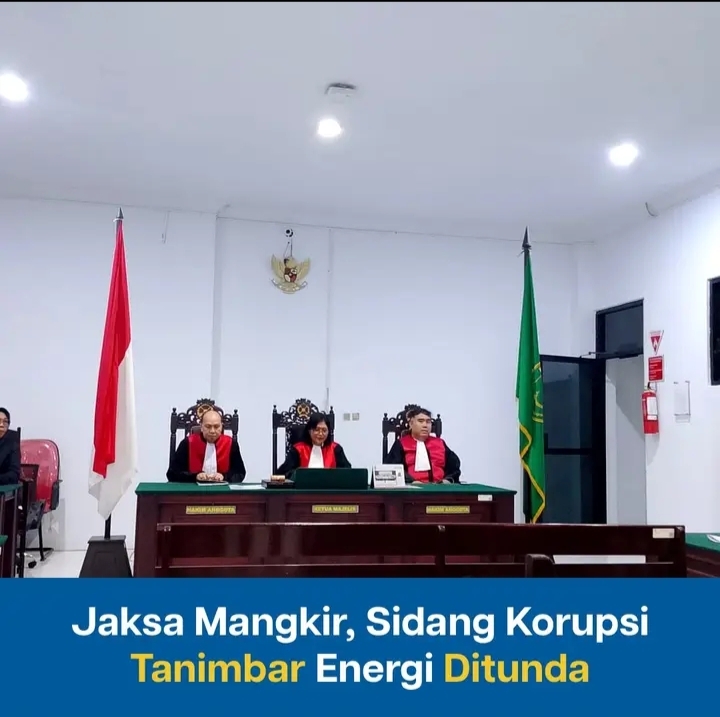 Ambon // Teropongbarat.com Sidang perkara dugaan korupsi pengelolaan penyertaan modal BUMD PT Tanimbar Energi tahun anggaran 2020-2022 di Pengadilan Tipikor pada Pengadilan Negeri Ambon, Senin (30/3/2026), terpaksa ditunda lantaran Jaksa Penuntut Umum (JPU) Kejaksaan Negeri (Kejari) Kabupaten Kepulauan Tanimbar (KKT) tidak menghadiri persidangan tanpa keterangan resmi.