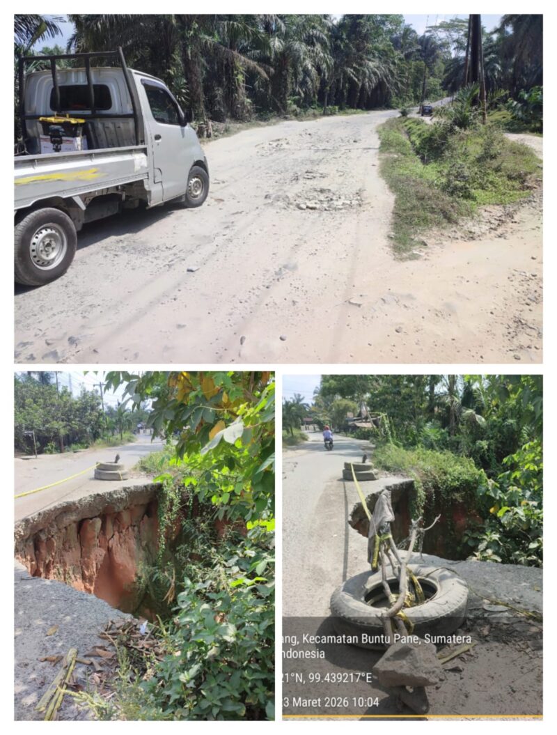 Asahan //Teropongbarat.com Warga keluhkan kerusakan 15 KM selama 2 tahun tanpa perbaikan, akses ekonomi terancam. Asahan, – Jalan lintas Kisaran–Pematang Siantar di Sionggang, Kecamatan Buntu Pane, Kabupaten Asahan nyaris putus akibat longsor. Terlihat separuh badan jalan sudah longsor di sisi jurang yang membuat kendaraan harus bergantian melewatinya. Warga khawatir jalan akan putus total. Selain itu, sudah banyak kecelakaan yang terjadi akibat jalan rusak terutama di malam hari.