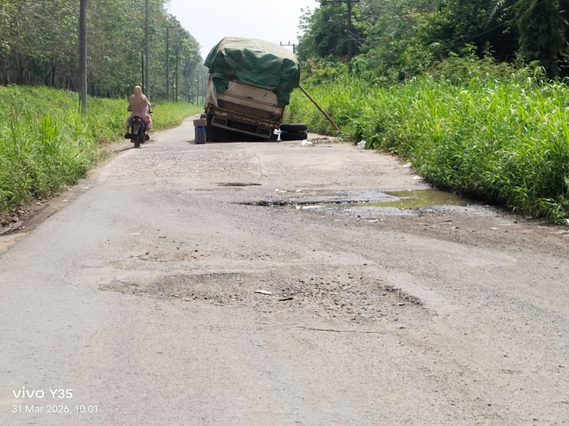 OGAN ILIR, 31 Maret 2026 — Kondisi jalan berlubang di ruas Tanjung Raja–Muara Kuang, Kabupaten Ogan Ilir, Sumatera Selatan, kembali menimbulkan persoalan serius bagi pengguna jalan. Pada Selasa (31/3/2026), sebuah truk bermuatan pupuk kandang mengalami kerusakan berat setelah melintasi jalan yang dipenuhi lubang di depan kawasan PT Perkebunan Karet Beriang, Desa Tanjung Temiang, Kecamatan Tanjung Raja. Gardan truk patah dan roda mengalami kerusakan parah, sehingga kendaraan nyaris terbalik dan harus ditahan menggunakan kayu sembari menunggu bantuan mekanik.