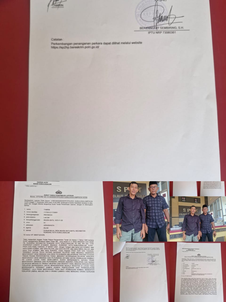 Laporan masyarakat yang diterima redaksi menyertakan berbagai dokumen resmi yang memperkuat klaim warga. Dokumen tersebut meliputi Surat Keterangan Tanah yang dikeluarkan kepala kampong, berita acara mediasi tingkat kecamatan, serta tapal batas antar-desa yang disahkan melalui SK Wali Kota Subulussalam.