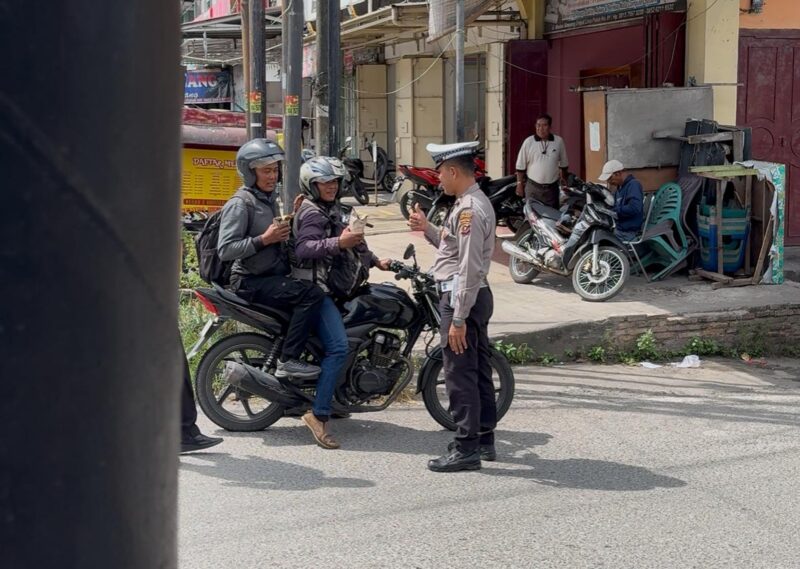 Dalam kegiatan ini, petugas membagikan nasi bungkus kepada pengendara yang taat aturan berlalu lintas, terutama yang menggunakan helm SNI saat melintas di simpang empat.