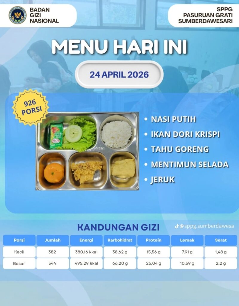 Sementara itu dalam Dapur SPPG Jumat 24.4.2026 ini adalah kepanjangan tangan dari Badan Gizi Nasional yang berkewajiban menyiapkan makan sehat bergizi, bagi anak-anak sekolah dari tingkat PAUD, TK, SD, SMP hingga SMA termasuk balita,” semoga program ini dapat terus berjalan dengan lancar memberikan manfaat yang besar bagi masyarakat terutama bagi generasi muda.