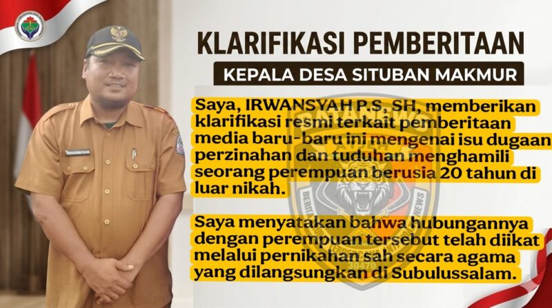 ‎Kepala Desa (Kades) Situban Makmur, Kecamatan Danau Paris, Irwansyah Putra Sambo, akhirnya buka suara terkait isu miring yang menerpa dirinya. Ia secara tegas membantah tudingan perzinahan maupun tuduhan menghamili seorang gadis berusia 20 tahun di luar nikah.