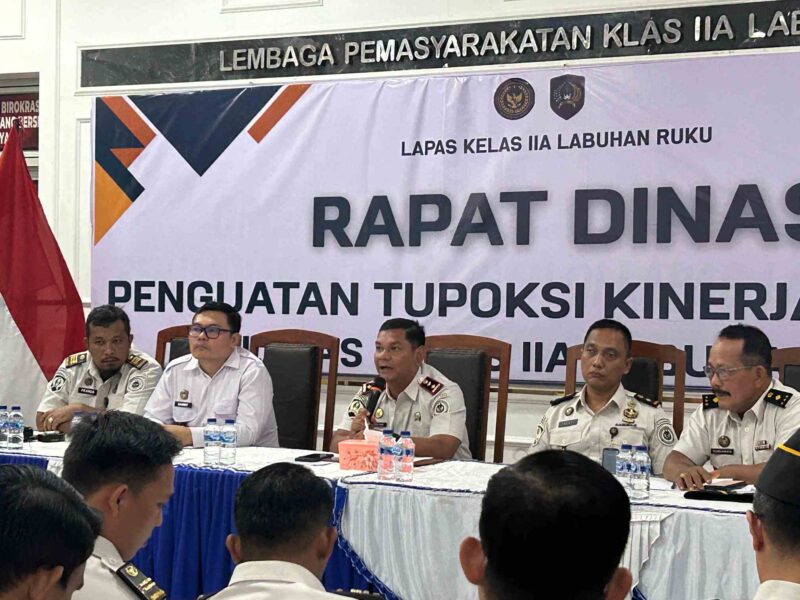 Batu Bara – 03- 01- 2026, Kepala Lembaga Pemasyarakatan (Lapas) Kelas IIA Labuhan Ruku memimpin rapat dinas perdana bersama seluruh jajaran pegawai di Aula Lapas Labuhan Ruku. Rapat ini menjadi momentum awal bagi Kalapas yang baru untuk menyampaikan arah kebijakan serta membangun sinergi dan kekompakan dalam memajukan Lapas Labuhan Ruku.
