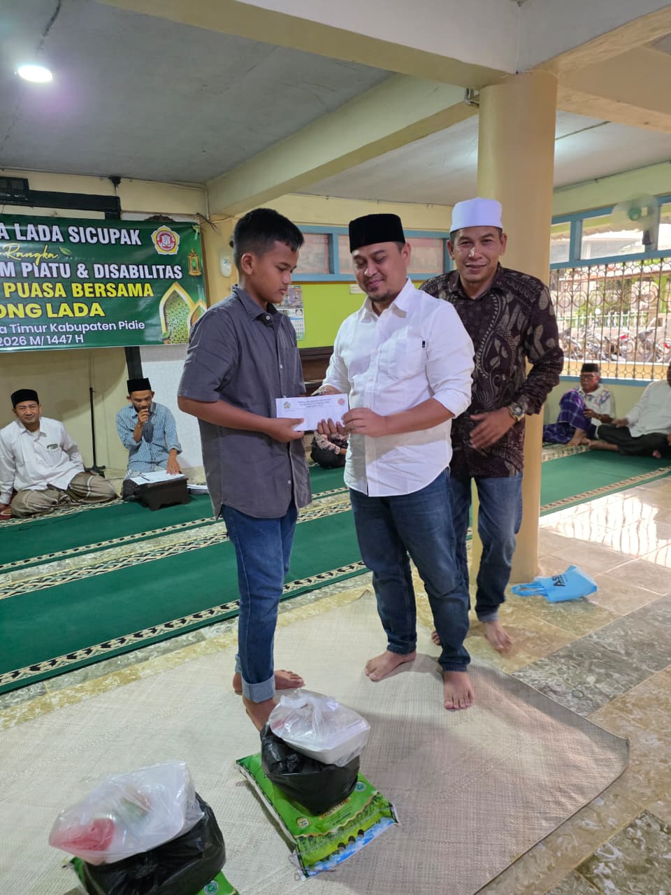 Kegiatan penyantunam dihadiri ratusan warga juga dirangkai acara buka puasa bersama seluruh masyarakat dipusatkan di dayah Gampong Lada, kecamatan Mutiara Timur, Pidie, Minggu (15/3/2026).
