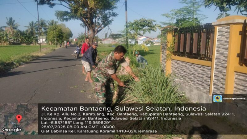 BANTAENG Teropong Barat.com, – Dalam upaya menciptakan lingkungan yang bersih, aman, dan nyaman bagi pengguna jalan, Serka Abd Majid, Babinsa Kelurahan Karatuang Koramil 1410-02/Eremerasa Kodim 1410/Bantaeng, melaksanakan kegiatan karya bakti bersama warga di Kampung Allu, Kelurahan Karatuang, Kecamatan Bantaeng, Kabupaten Bantaeng. Jum’at 25 Juli 2025.