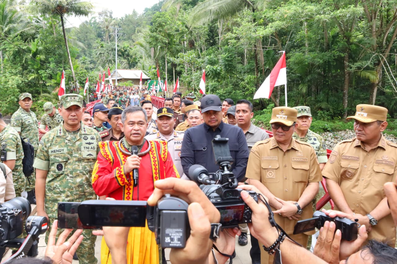 Setibanya di lokasi, Kasad dan rombongan kembali disambut masyarakat dengan tarian adat. Bupati Nias Selatan kemudian memberikan pakaian adat lengkap beserta mahkota kepada Kasad dan Ketua Umum Persit sebagai bentuk penghormatan dan ungkapan terima kasih atas pembangunan jembatan tersebut. Kegiatan dilanjutkan dengan paparan dari Dirfasjas Pusziad mengenai pembangunan jembatan sebelum dilakukan peresmian dan peninjauan.