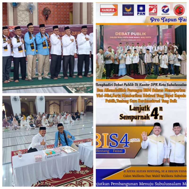 4. Paslon Bintang-Faisal dianggap pasangan paling ideal pelangi antara masyarakat DAS (daerah aliran sungai) Singkil-Kombih lae shoraya dan masyarakat daratan kota Subulussalam. Selain itu Tim Suksesi Bintang-Faisal mampu menangkal isu-isu miring, berita berita hoax, tentang perjalanan roda pemerintahan Kota Subulussalam selama satu periode berkuasa. Dengan semua kekuatan Vigur dan finansial Tim yang memadai.