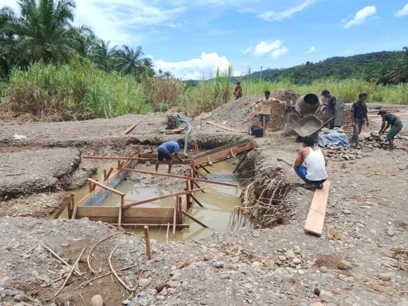 Pengerjaan jembatan dilakukan secara bertahap dengan melibatkan personel Koramil 09/Sosa Kodim 0212/TS bersama masyarakat dan tenaga tukang. Sejumlah tahapan pekerjaan yang telah dilaksanakan meliputi pengecoran pondasi dan blok beton di sisi tepi dekat, pembuatan mal foot plat, perakitan besi, hingga pengecoran foot plat. Saat ini, progres pembangunan jembatan gantung tersebut telah mencapai sekitar persen.