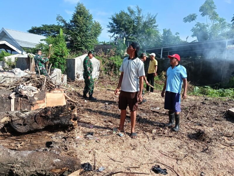 Dalam kegiatan ini, Personel Koramil bersama warga nampak semangat melakukan pekerjaan pembersihan lokasi pembangunan masjid dengan menebang pohon meratakan sisa bangunan dan meratakan tanah.