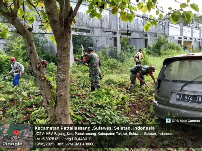 TAKALAR — teropongbarat.com|Personel Koramil 1426-07/Pattallassang Kodim 1426/Takalar bersama warga gotong-royong melaksanakan pembersihan pinggir kiri kanan jalan dan selokan yang sudah rimbun oleh semak belukar di Lingkungan Bajeng Kelurahan Bajeng, Kecamatan Pattallassang, Kabupaten Takalar, Senin 19/05/2025.