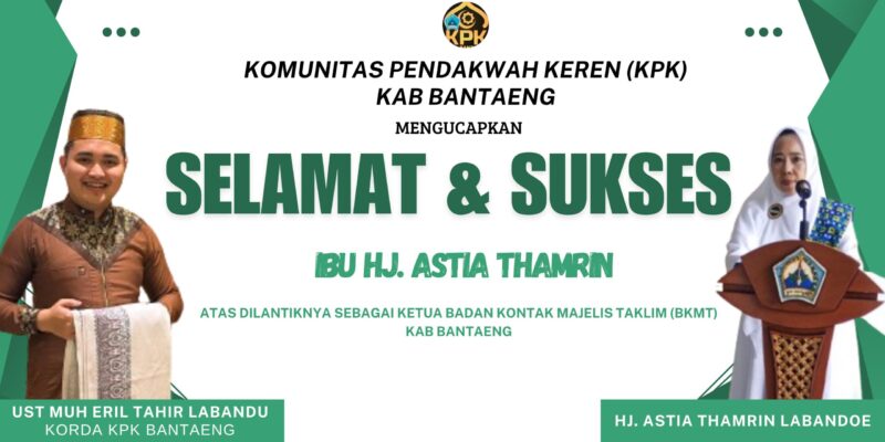 BANTAENG Teropong Barat.com, Koordinator Daerah Komunitas Pendakwah Keren (KORDA KPK) Zona Kab Bantaeng Muh Eril Tahir Labandoe Makkatutu, memberikan ucapan selamat atas dilantiknya sebagai Ketua Badan Kontak Majelis Taklim Kab Bantaeng (Hj. Astia Thamrin) yang baru saja dilantik hari ini di Tribun Pantai Seruni Kab Bantaeng(27/05/2025).