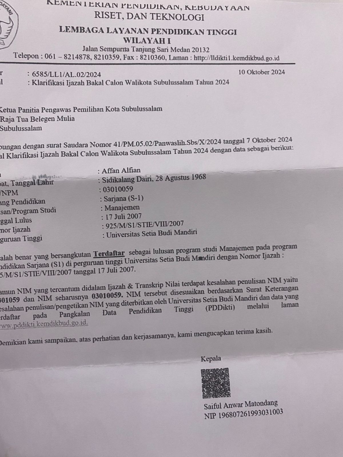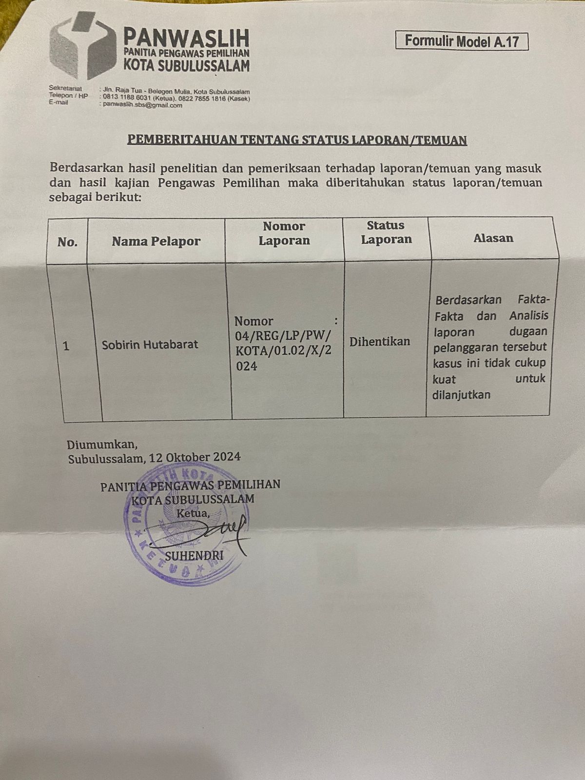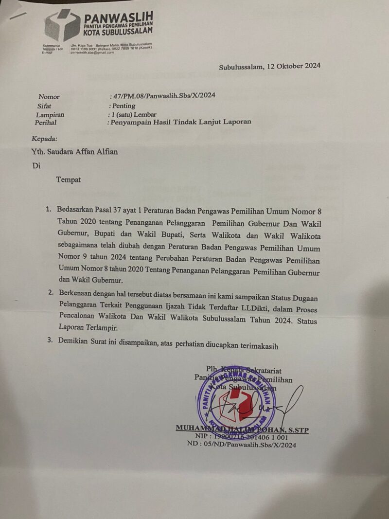 Hari ini telah dapat dibuktikan, bahwa laporan dan pengaduan sejumlah pihak terkait Ijajah H. Affan Alfian Kandidat Walikota Subulussalam bernomor urut (4)empat tersebut, terjawab sudah. Dengan dibuktikan dari surat Panwaslih Kota Subulussalam bernomor: 47/PM.08/panwaslih.Sbs/X/2024. Dari surat Panitia pengawas pemilihan tersebut dijelaskan bahwa laporan terkait ijajah Saudara Affan Alfian Bintang berdasarkan Fakta Fakta tidak bermasalah dan analisis dari laporan yang diduga memfitnah ijajah saudara Affan Alfian tidak memiliki arah bukti kuat.**) editorial..