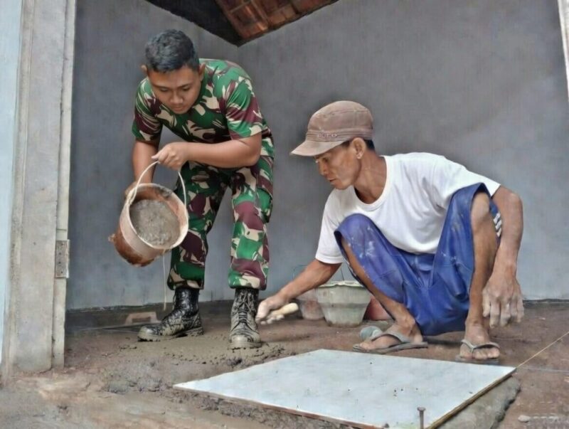 Di tengah hamparan material bangunan dan aroma semen yang masih basah, prajurit Satgas TMMD Ke-127 Kodim 0819/Pasuruan terlihat tekun menata satu per satu kepingan keramik di lantai mushola, yang sedang dibangun di Dusun Kili, Desa Wonosari, Kecamatan Gondangwetan, Kabupaten Pasuruan, Minggu (1/3/2026)
