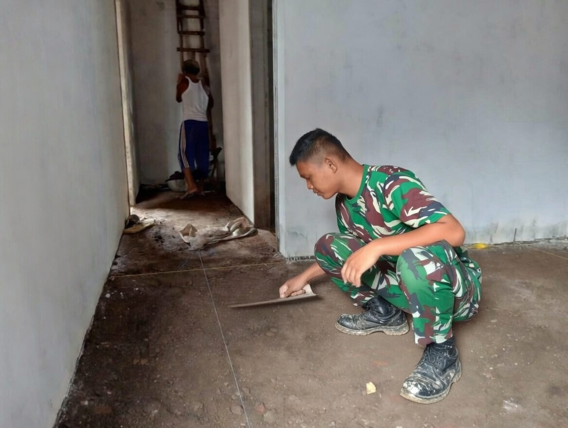 Dengan seragam loreng yang sedikit berdebu, Anggota Satgas bekerja teliti. Mereka mengukur garis lurus, meratakan adukan semen, lalu perlahan menempelkan keramik agar tersusun rapi. Setiap gerakan dilakukan penuh kehati-hatian, seolah lantai mushola itu bukan sekadar bangunan, melainkan tempat ibadah yang kelak menjadi pusat kebersamaan warga.
