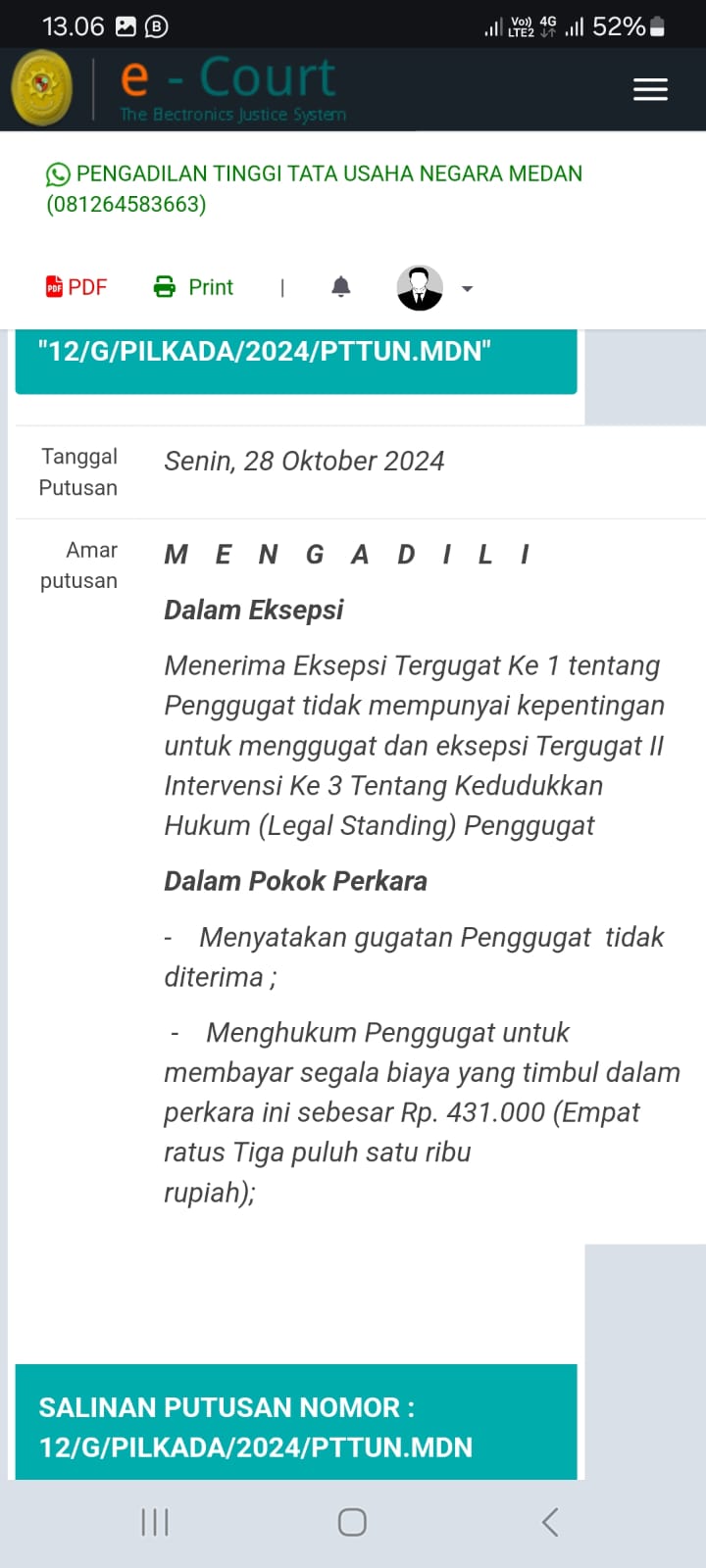 Subulussalam, teropongbarat.co.Gugatan Fakar Paslon Nomor Urut 3 Wali dan Wakil Walikota Subulussalam kandas sudah. Nyatanya Pengadilan PTUN Medan dalam ammar putusannya mengadili “bahwa Gugatan Pengugatan tidak diterima bahkan menghukum penggugat untuk membayar segala biaya yang timbul dalam perkara tersebut” Demikian substansi penting putusan PTUN Medan tersebut. Senen (28/10/24).