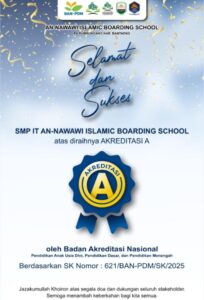 BANTAENG, Teropong Barat.com – SMP IT An-Nawawi Islamic Boarding School Pa’bumbungang Bantaeng mencatatkan pencapaian membanggakan dengan meraih peringkat A dalam akreditasi yang dilakukan oleh Badan Akreditasi Nasional Pendidikan Dasar dan Menengah (BAN-PDM).