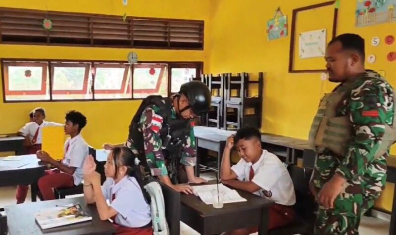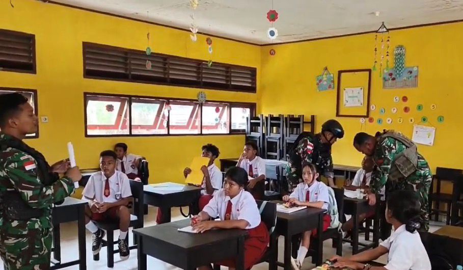 [ DISTRIK VASCODAMNEM, TELUK BINTUNI ] – Untuk menanamkan semangat belajar dan karakter disiplin, Satgas Yonif 410/Alugoro mengajarkan Beberapa materi tentang kenegaraan kepada para siswa/siswi di SD Inpress Stengkol 3 di Distrik Vascodamnem Kab. Teluk Bintuni, Papua Barat. Senin, (20/4/2026).Serda Ahmad Romi Saputra menjelaskan bahwa kegiatan tersebut sebagai wujud perhatian Satgas di bidang pendidikan guna mencetak generasi penerus yang mempunyai karakter dan berdisiplin tinggi, mengingat bangsa indonesia adalah bangsa yang besar maka harus disiapkan sember daya manusia yang kuat untuk menghadapi tantangan masa depan.