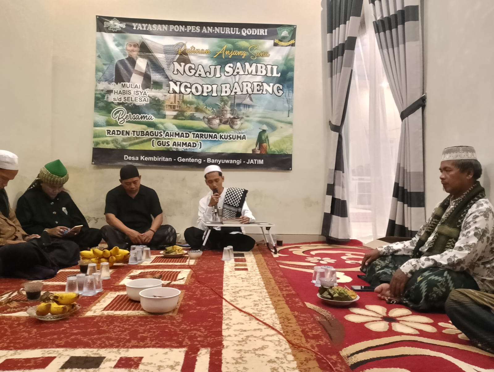 Banyuwangi//Teropongbarat.com Suasana hangat penuh kebersamaan tampak dalam kegiatan rutin “anjang sana ngaji sambil ngopi bareng” yang digelar oleh Majelis Ta’lim Raudhatul Jannah. Kegiatan ini menjadi salah satu bentuk syiar keagamaan yang dikemas santai namun tetap sarat makna, dengan menghadirkan Raden Tubagus Ahmad Taruna Kusuma atau yang akrab disapa Gus Ahmad sebagai pengisi kajian.Rutinan ini dilaksanakan secara bergilir dari rumah ke rumah para jama’ah di Desa Kembiritan, Kecamatan Genteng, Kabupaten Banyuwangi. Selain mempererat ukhuwah islamiyah, kegiatan ini juga menjadi sarana mendekatkan masyarakat dengan ilmu agama dalam suasana yang akrab dan penuh kekeluargaan.
