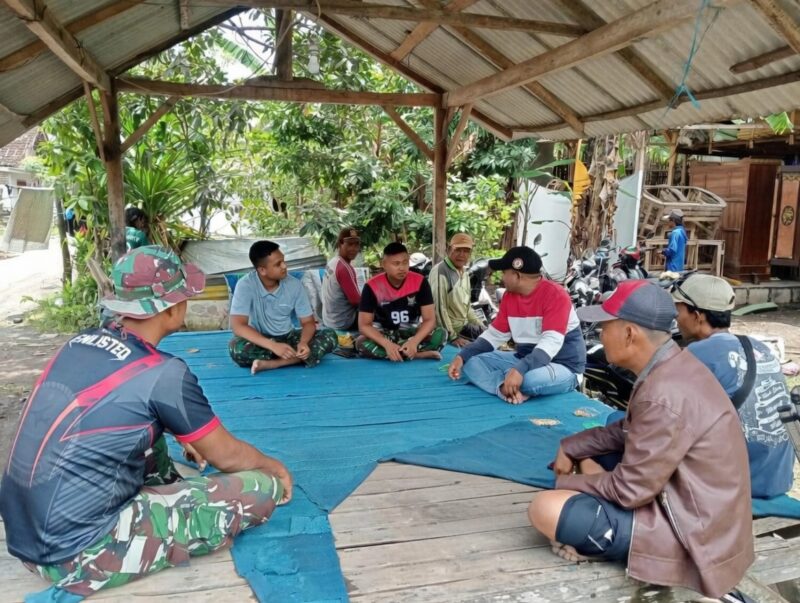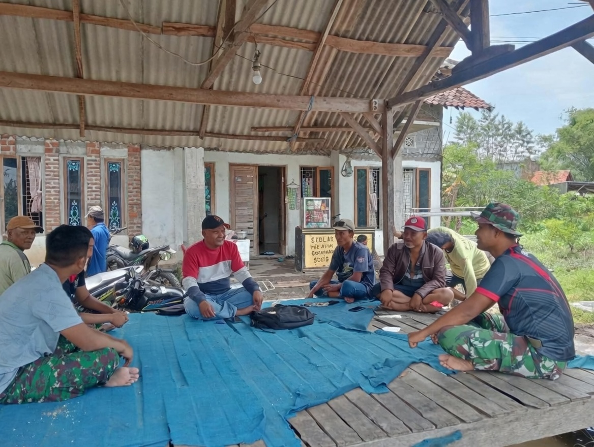 Teropongbarat.com Dalam sebuah gubuk sederhana berdinding anyaman bambu dan beratap seng, beberapa pria duduk melingkar di atas terpal biru yang sudah lusuh. Sinar matahari sore menembus celah daun dan ranting, menerangi wajah-wajah yang lelah setelah seharian mengangkut pasir, mencampur semen, dan memasang bata.Minggu siang (8/3/2026) di Desa Wonosari, Kecamatan Gondangwetan, Kabupaten Pasuruan, prajurit Satgas TMMD Ke-127 Kodim 0819/Pasuruan tidak langsung kembali ke pos setelah bekerja. Mereka memilih beristirahat bersama warga sambil berbincang santai dalam kegiatan Komunikasi Sosial (Komsos).