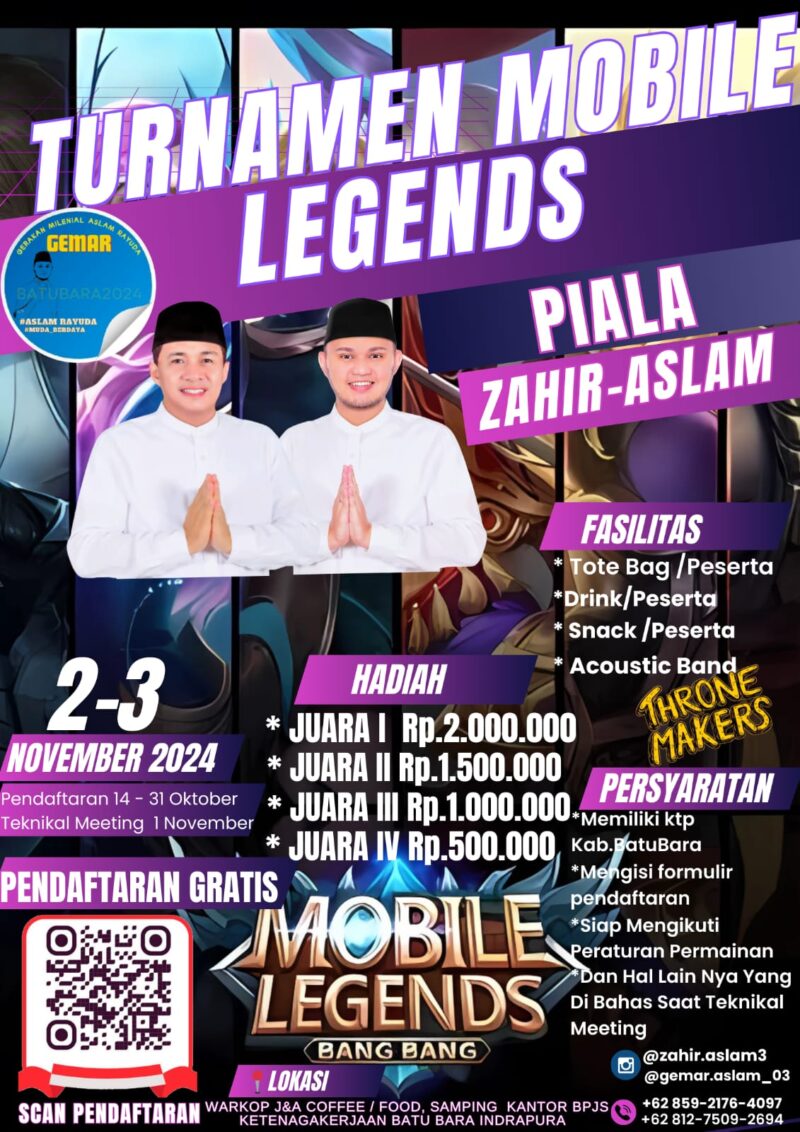 Batu Bara, – Pendaftaran tournament Mobile Legend memperebutkan uang pembinaan jutaan rupiah dan piala Zahir-Aslam Paslon 03