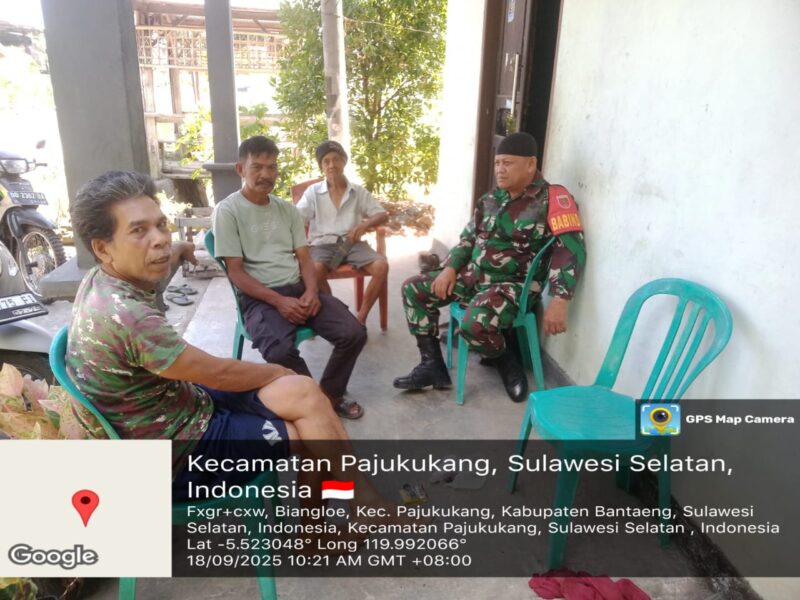 BANTAENG, Teropong Barat.com, – Babinsa Desa Biangloe, Koramil 1410-03/Tompobulu, Sertu Mansyur, melaksanakan komunikasi sosial (Komsos) bersama warga binaan di Dusun Malero, Desa Biangloe, Kecamatan Pajukukang, Kabupaten Bantaeng, pada Kamis (18/9/2025) pukul 11.46 WITA.