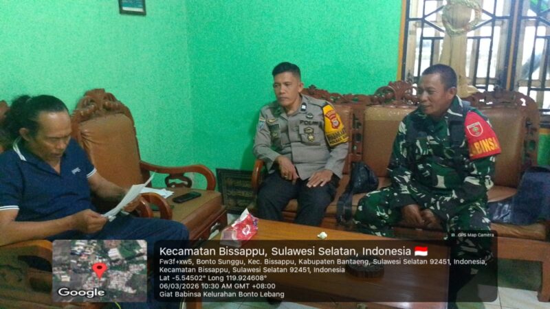 BANTAENG, Teropong Barat.com, – Babinsa Kelurahan Bonto Lebang, Koramil 1410-01/Bissappu, Kodim 1410/Bantaeng, Serka Abdul Rahman bersama Bhabinkamtibmas melaksanakan kegiatan komunikasi sosial (Komsos) dengan Ketua RW 4, Guna mempererat hubungan serta membangun komunikasi yang baik dengan masyarakat di wilayah Beloparang, Kelurahan Bonto Lebang, Kecamatan Bissappu, Kabupaten Bantaeng. Jumat (06/03/2026)