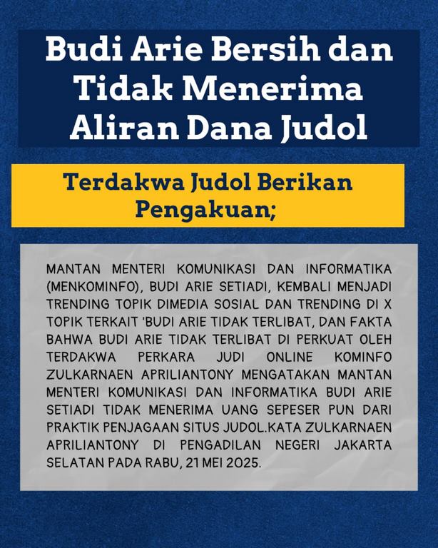 Dalam persidangan yang digelar di Pengadilan Negeri Jakarta Selatan pada Rabu, 21 Mei 2025, terdakwa kasus judi online, Zulkarnaen Apriliantony, menyatakan bahwa Budi Arie tidak menerima uang sepeser pun dari praktik penjagaan situs-situs judi online.