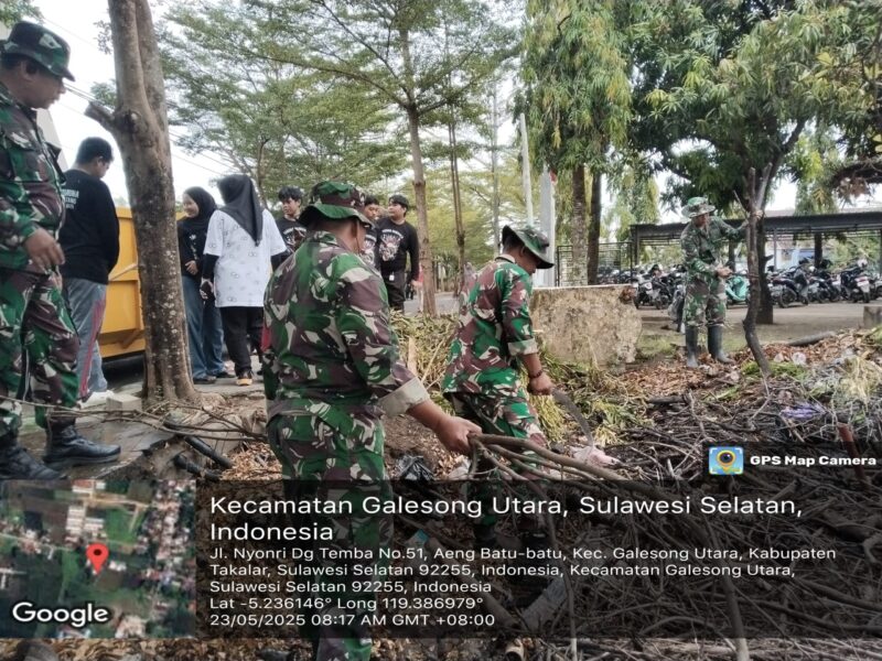 TAKALAR – teropongbarat.com|Untuk mewujudkan lingkungan yang bersih dan sehat, Personel Koramil 1426-03/Galut, Kodim 1426/Takalar bersama warga melaksanakan kerja bakti pembersihan lingkungan dengan sasaran pinggir kiri kanan jalan dan pekarangan Kantor Koperasi Merah Putih di Desa Aeng Batu-batu, Kecamatan Galesong Utara, Kabupaten Takalar, Jum’at, (23/05/2025).
