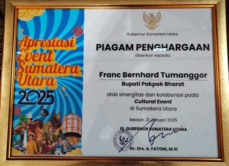 Piagam penghargaan ini diterima oleh Plt. Kepala Dinas Pariwisata dan Kebudayaan Pakpak Bharat, Maranatha Padang Bth, M.Si pada acara Peluncuran Calender Of Event 2025 di Pos Bloc, Medan (21/01/2025).