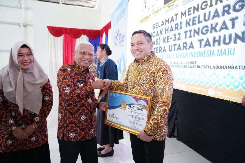 Labuhan Batu,Teropong Barat.com/Bupati Pakpak Bharat, Franc Bernhard Tumanggor menerima Piagam Penghargaan bagi Kabupaten Pakpak Bharat sebagai salah satu Kabupaten/Kota Dengan Cakupan Laporan Kelompok Kegiatan dan Setara Kelompok Terbaik Tahun 2025. Bersama Ketua TP PKK Kabupaten Pakpak Bharat, Ny. Juniatry Franc Bernhard Tumanggor, Franc menerima penghargaan ini diserahkan oleh Wakil Gubernur Sumatera Utara, H Surya, B.Sc dalam Puncak Peringatan Hari Keluarga Nasional ke 32 Provinsi Sumatera Utara di Kabupaten Labuhan Batu (22/07/2025).
