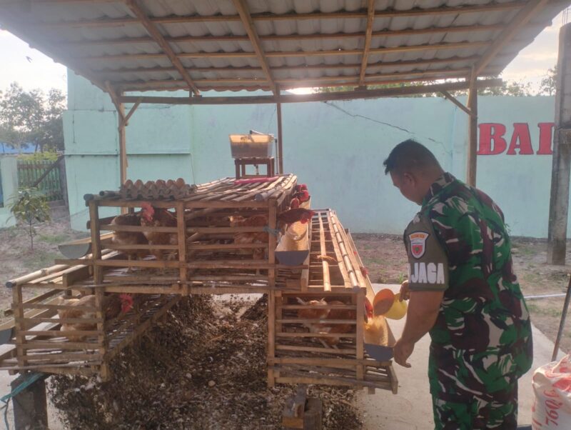 TAKALAR – teropongbarat.com|Piket Makodim 1426/Takalar, Serda Amiruddin tampak sedang merawat tanaman, memberi makanan pada ikan dan ayam petelur yang memanfaatkan lahan kosong di Pekarangan Kantor Kodim 1426/Takalar Kelurahan Kalabbirang Kecamatan Pattallassang Kabupaten Takalar. Rabu, (03/09/2025)